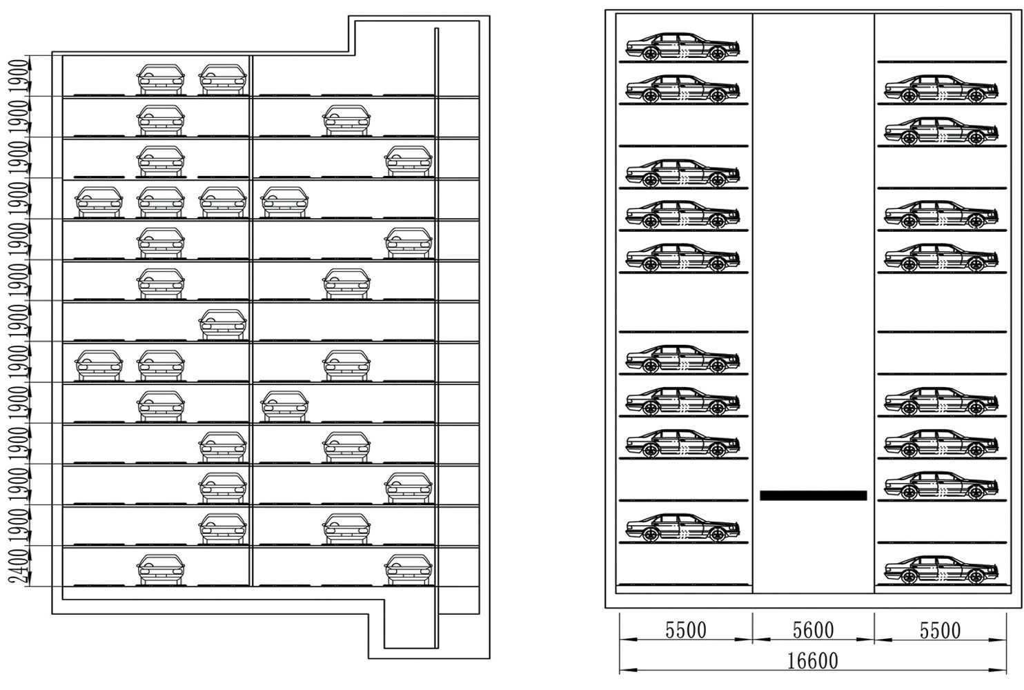 搬運器在一個平面上進行往復(fù)移動,汽車在搬運器上完成搬運和存放的功能。搬運器借助升降機和水平臺車實現(xiàn)垂直移動到相應(yīng)的多個平面。